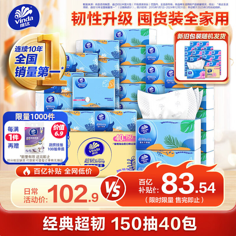 得宝(TEMPO)一博同款 抽纸 欧式假日4层80抽*10包 湿水不易破 真M码 纸巾单提