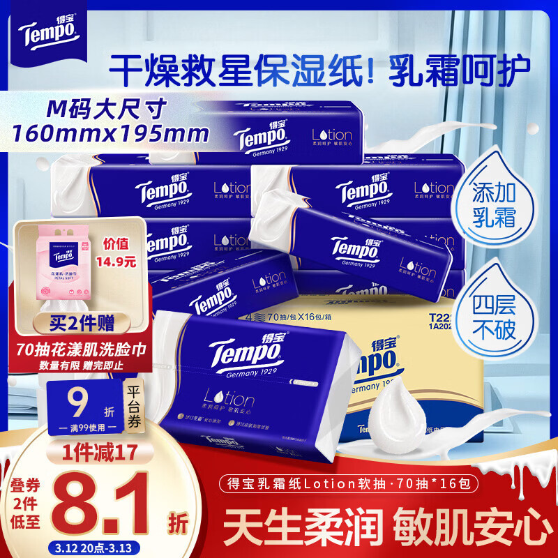 得宝(TEMPO)抽纸试用装 天然无香4层加厚90抽*3包 真M码 纸巾 餐巾纸