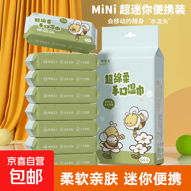 婴童迷你湿巾小包婴幼儿手口清洁湿巾随身便携抽取式湿纸巾 小蜜蜂湿巾1提 8抽 8包