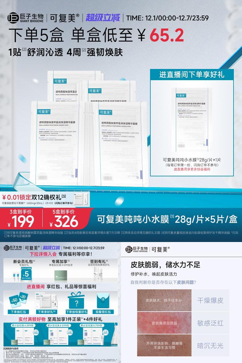 拍5件 401元 可复美旗舰店 可复美小水膜保湿补水修护面膜