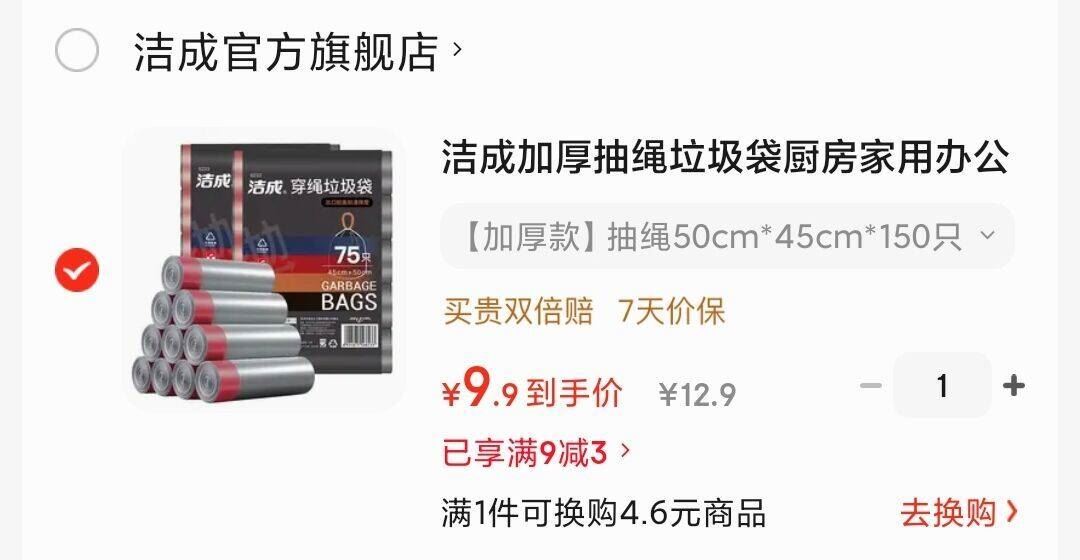 9.9元 史低价共10卷! 洁成抽绳自动收口垃圾10卷150只 加厚加大款 评价很好