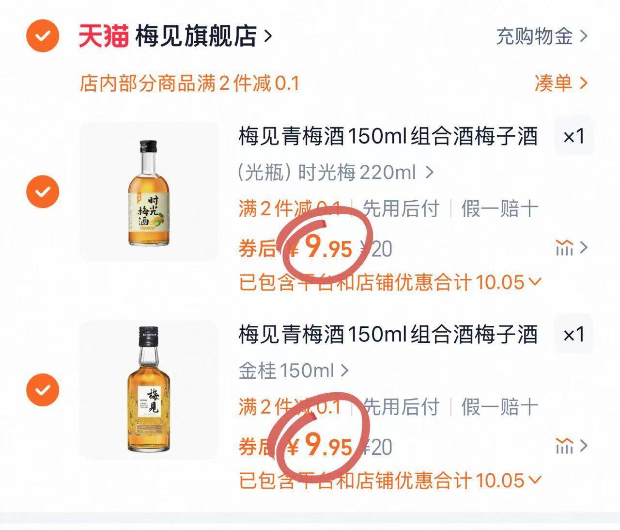 9.9元/瓶!商超1瓶20多元 2件,拍2件19.9元!好价抓紧 梅见 梅子酒12度150ml*2瓶