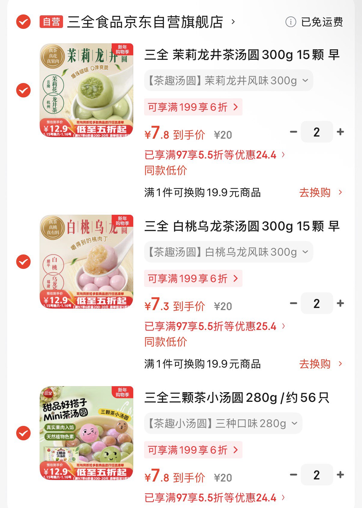 领黑五200-20券 领55折券 三全汤圆300g 15颗