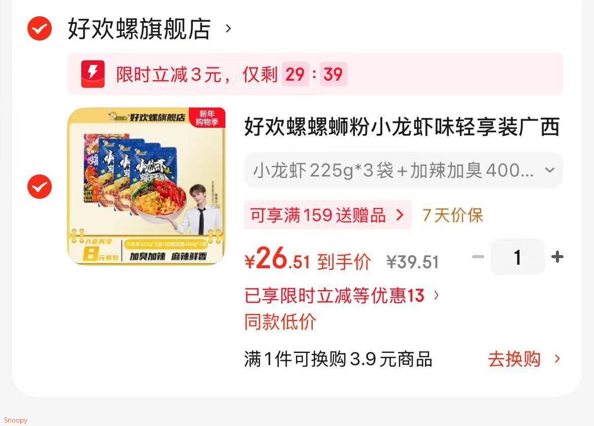 领10.01-10 部分掉落5券,好欢螺 螺蛳粉 小龙虾口味225g*3袋 加辣加臭400g*1袋 26.5