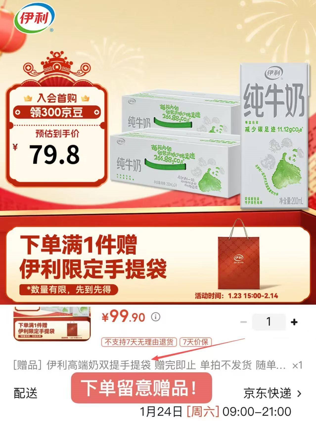 伊利纯奶发車 伊利 纯牛奶200ml*24盒*2箱 62.9亓,新客减3亓 赠礼袋