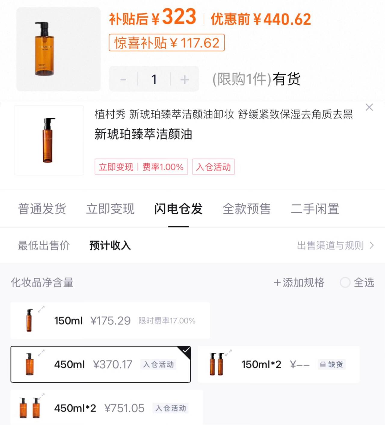 百补美妆车 植村秀卸妆油 450ml到手323 锝.物452
