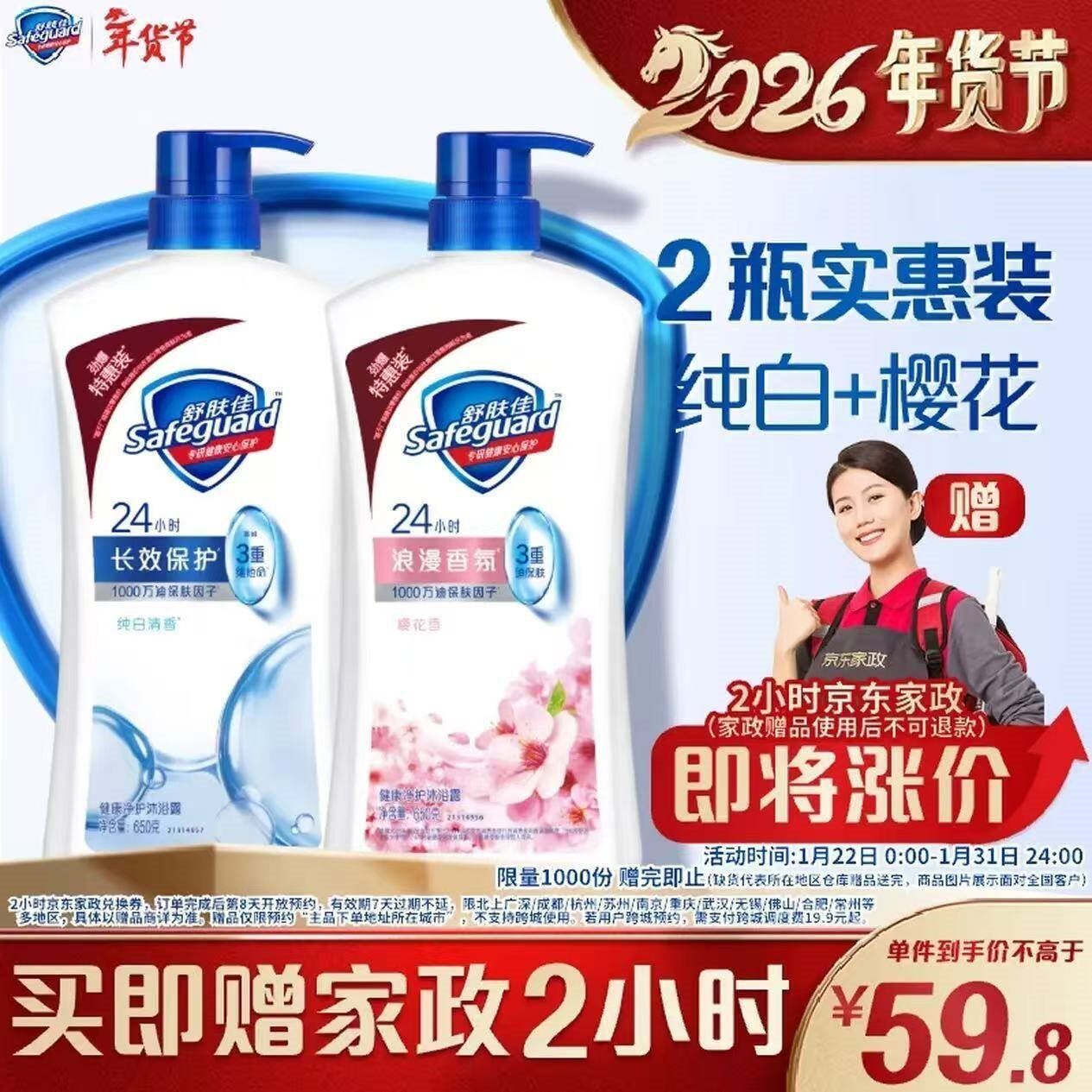 舒肤佳家政发車 舒肤佳 净护沐浴露650g*2瓶 59.8亓自营包U,贈保洁2h