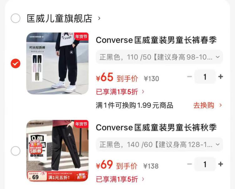 匡威儿童五折服饰集 1梭织保暖束脚裤69元 2短窽连帽羽绒服199元