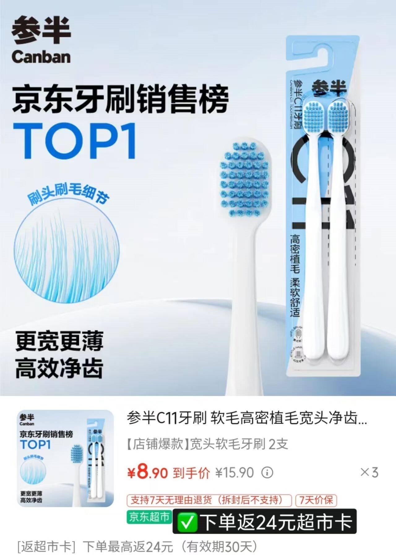 冲参半牙刷shen車 自营 参半 宽头软毛牙刷2支 买3件26.7亓包邮,限时包邮