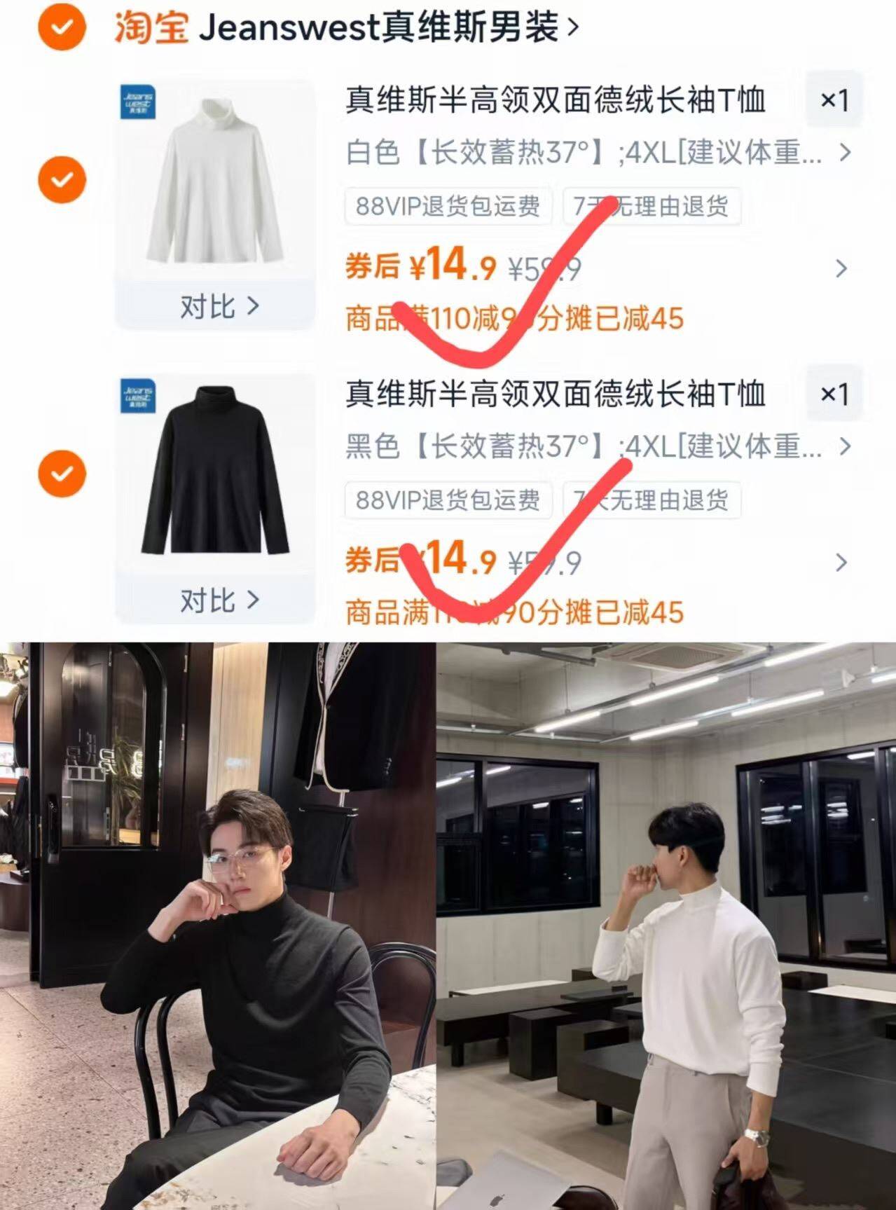 速度拍2件29.8元 划14.9/件元bug价 真维斯 德绒高领打底衫