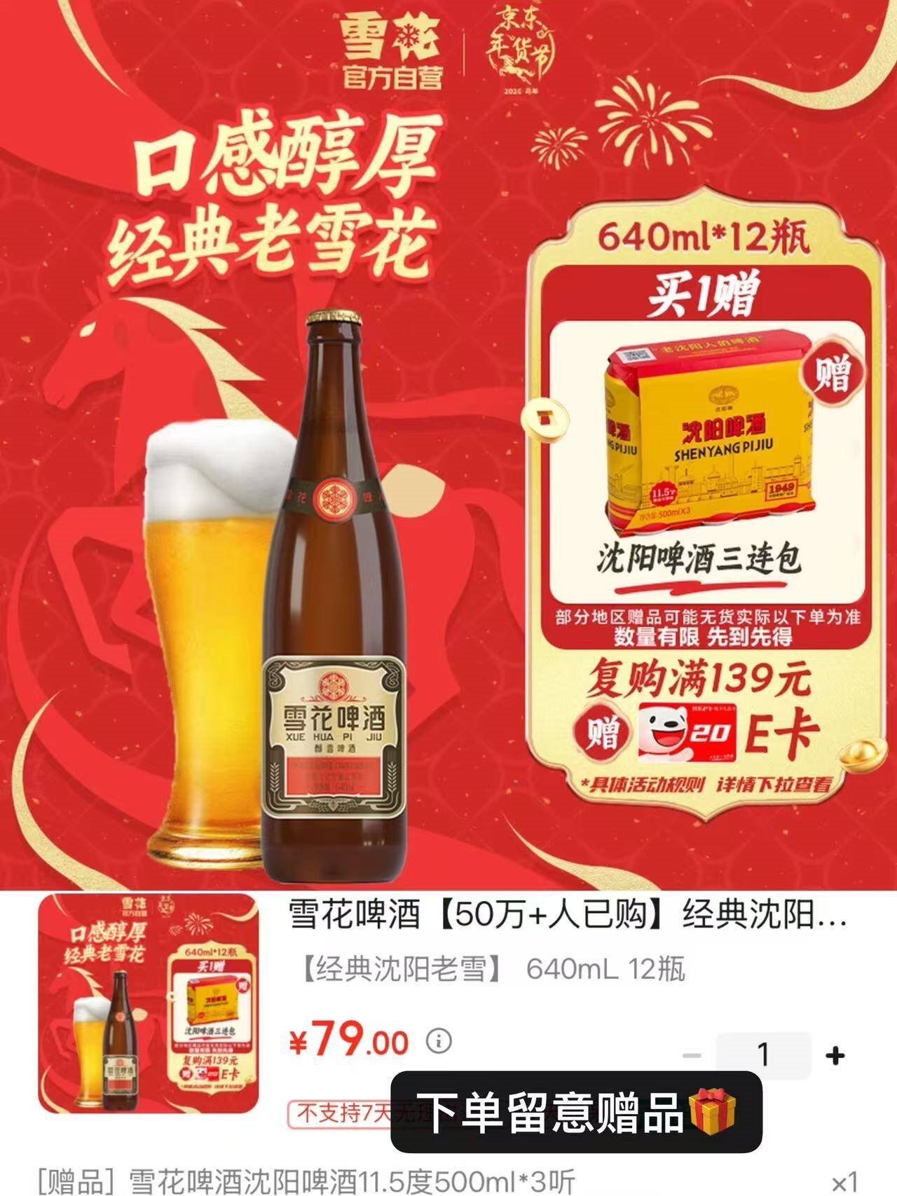 老雪啤酒加赠 先领79-8卷 自营 雪花 经典沈阳啤酒12瓶