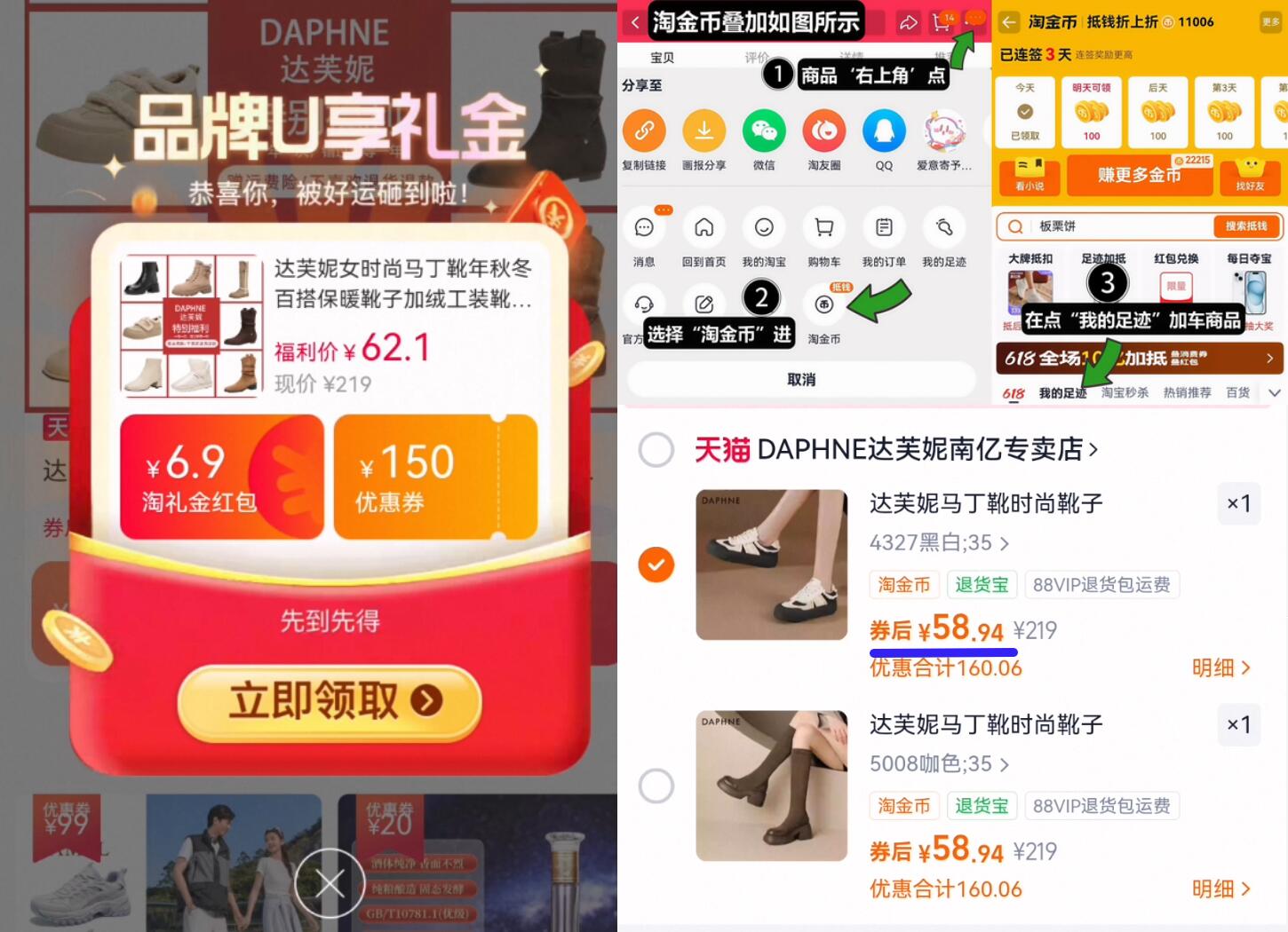 59亓起史低叠3亓淘金币 达芙妮 百搭马丁靴合集 1、如图点右上角3个点,选淘金币