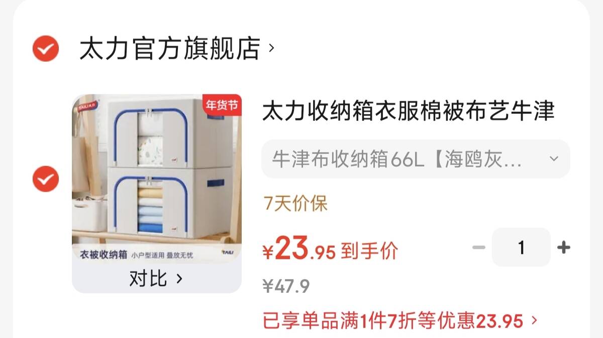 太力牛津布收纳箱66L23元.9 超大容量,衣物/棉被/玩具等 领
