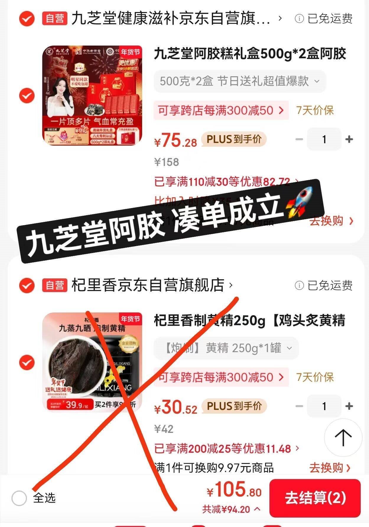 九芝堂凑単車 Plus先领2张补帖卷 九芝堂 阿胶糕礼盒500g*2盒