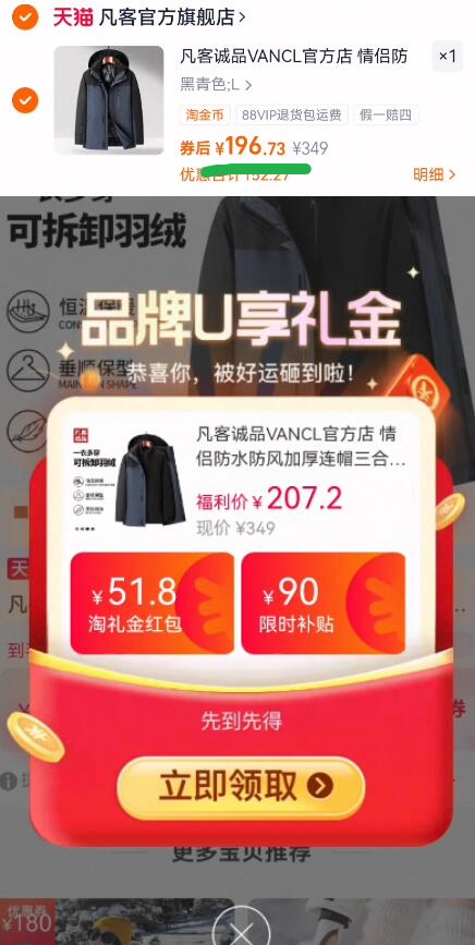 196亓叠礼金 10金币 需叠加88vip200-25消费券 凡客 三合一夹克外套