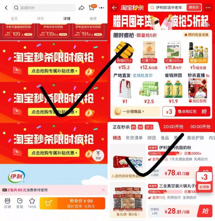 1.如图下划详情进入淘宝秒杀 2.找到商品后,加入购物车1件 -