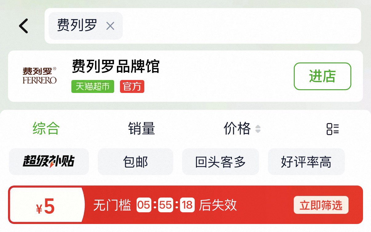 猫超首页搜 费列罗 领5赠金,
