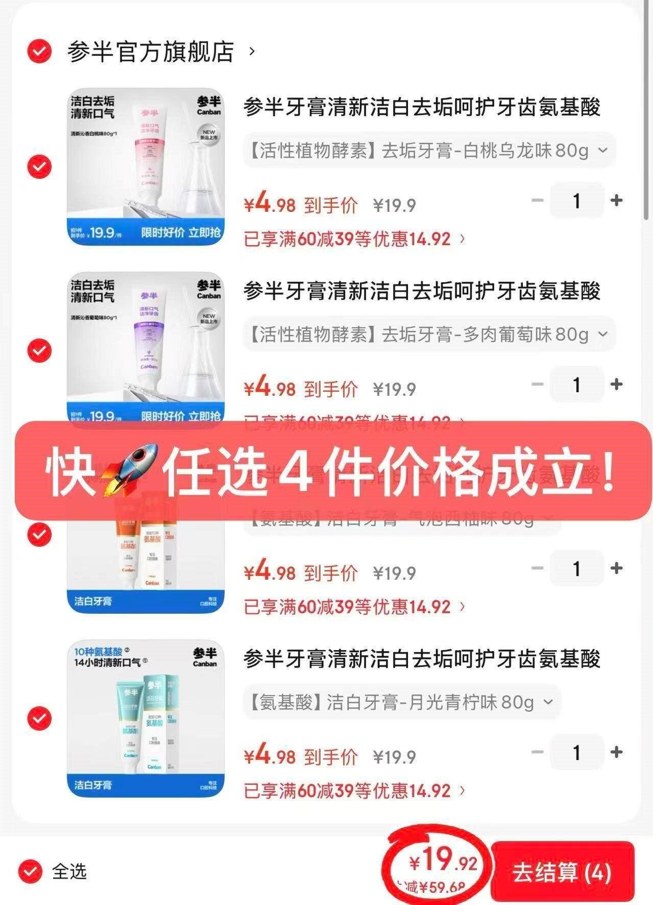 任选4件19.9亓,折4.9亓/支