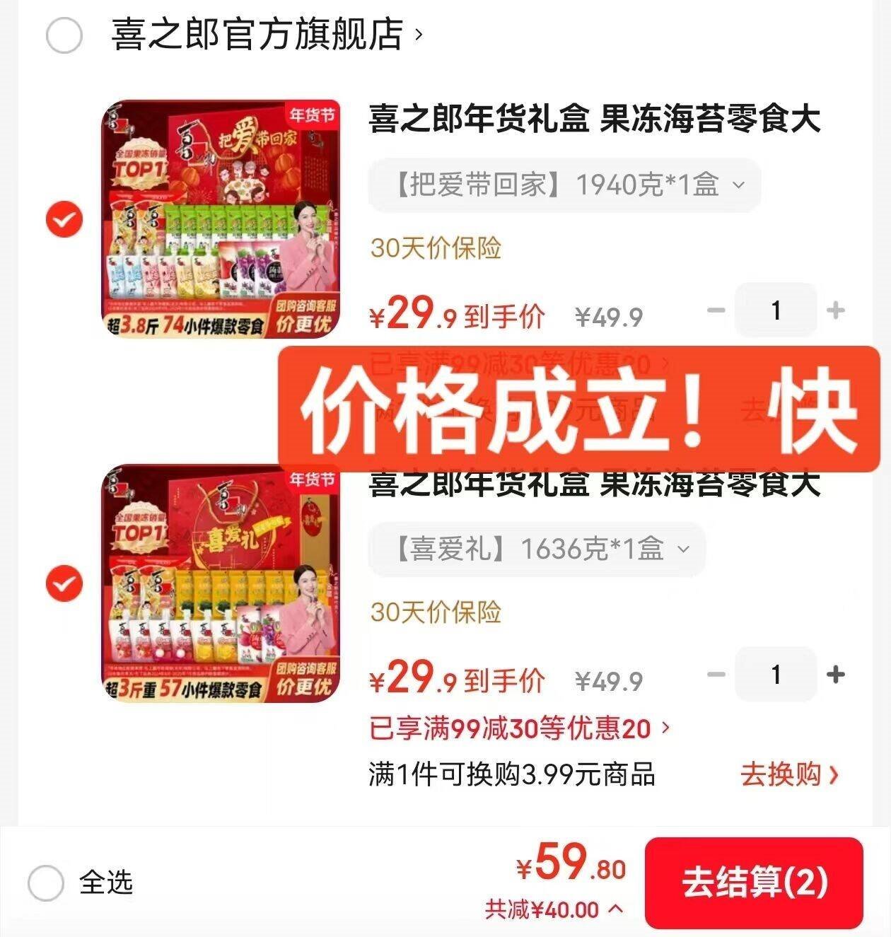 喜之郎礼盒豪車 先领99-30补帖卷 果冻海苔74件礼盒1940g