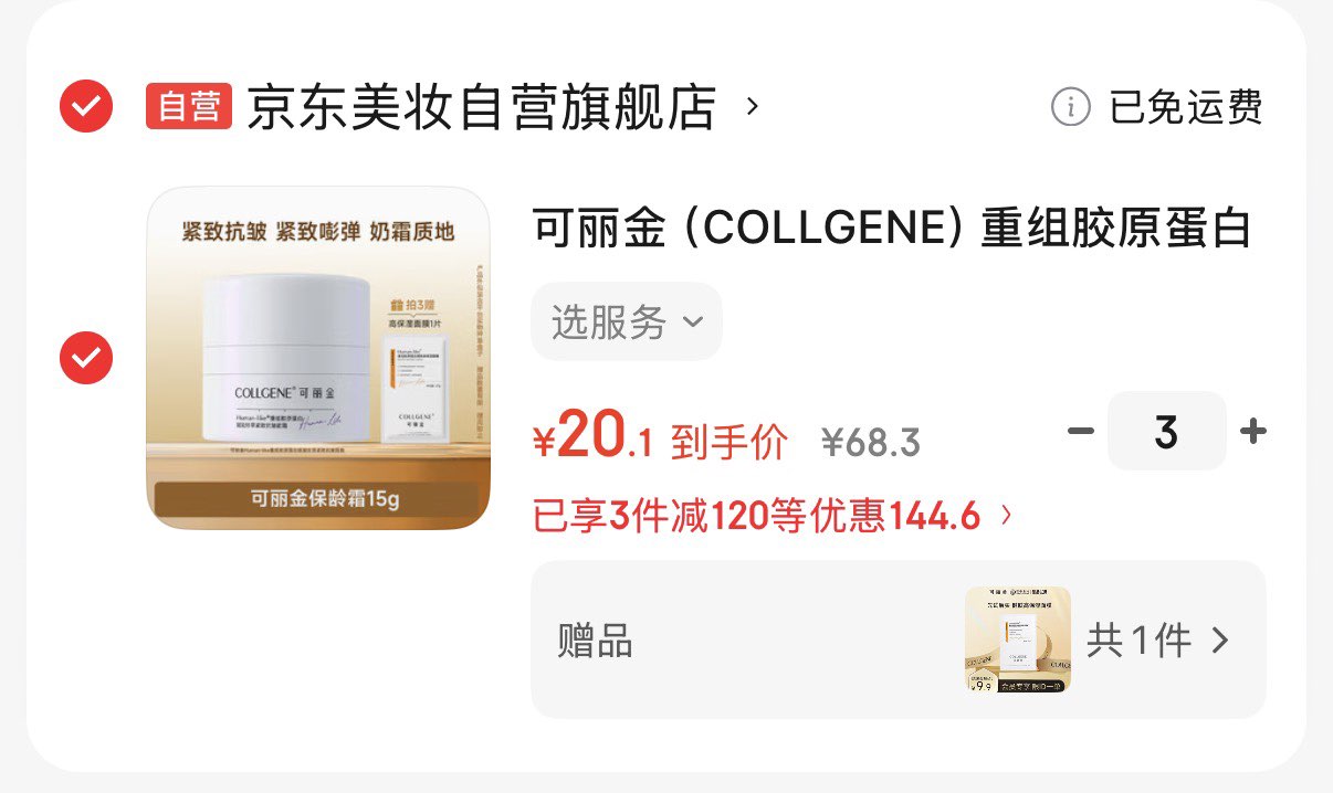 可丽金重组胶原蛋白面霜15g 拍3件60亓 折20亓/件 赠高保湿面膜1片