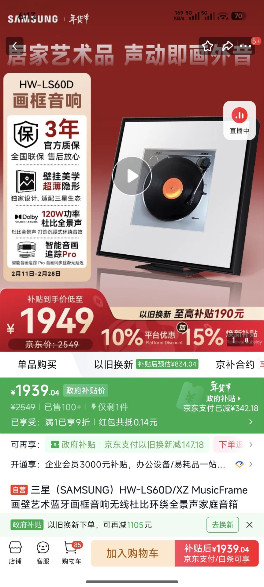 三星HW-LS60D/XZ MusicFrame画壁艺术蓝牙画框音响杜比环绕【1939】叠国补