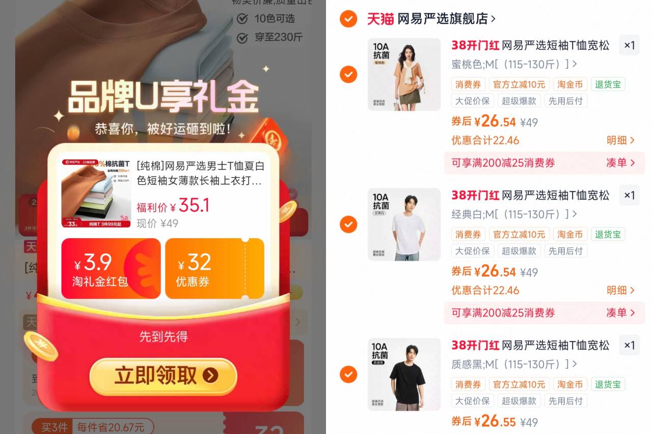 网易严选100%纯棉T恤 任选3件79.6元,折26一件