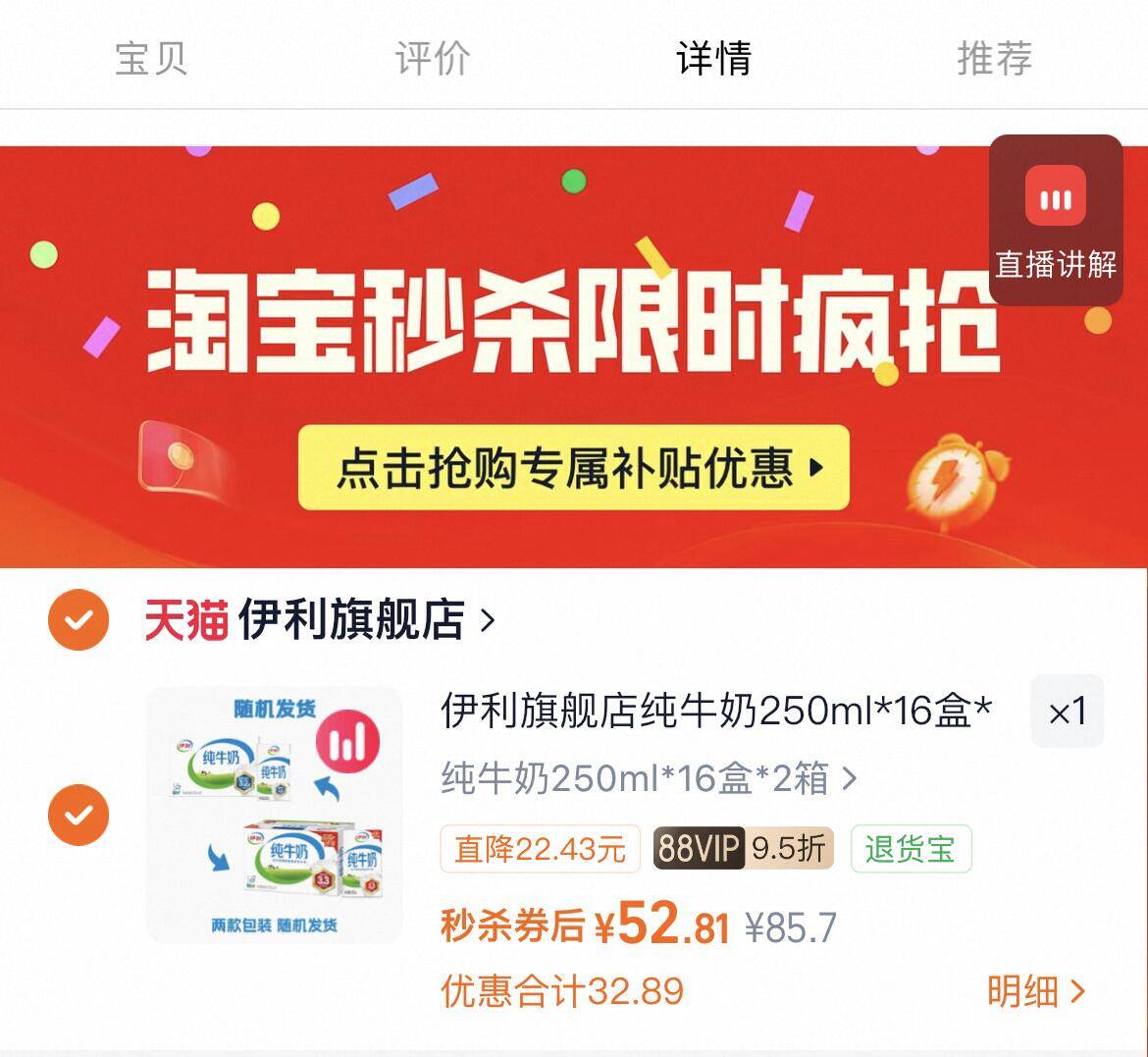 下拉拍52亓折1.6亓/盒 伊利 纯牛奶250ml*16盒*2箱