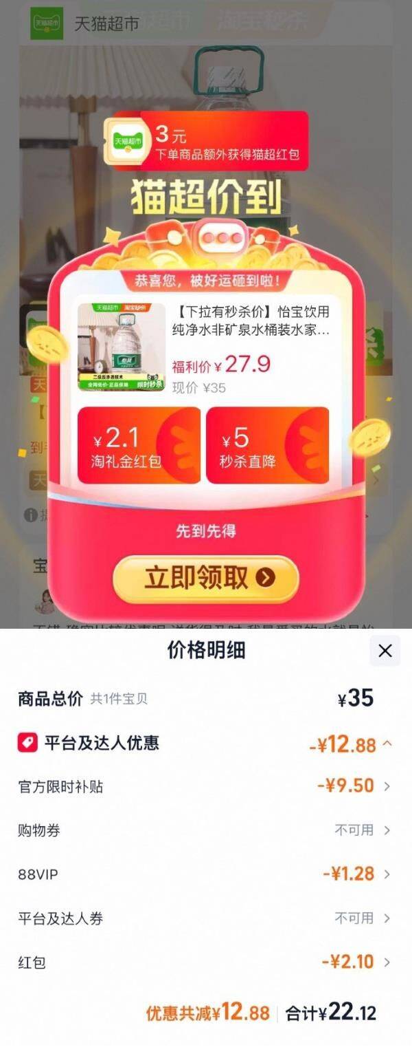 怡宝饮用纯净水4.5L*4桶,领礼金 详情页进入淘宝秒杀页面下单,拍1件vip 22.12 图一显示下单返3红包,相当于到手19.12元