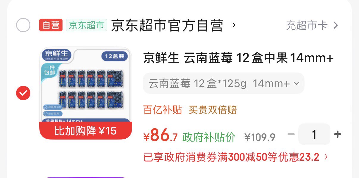 领9-5券 领300-50消费券 京鲜生云南蓝莓12盒14mm