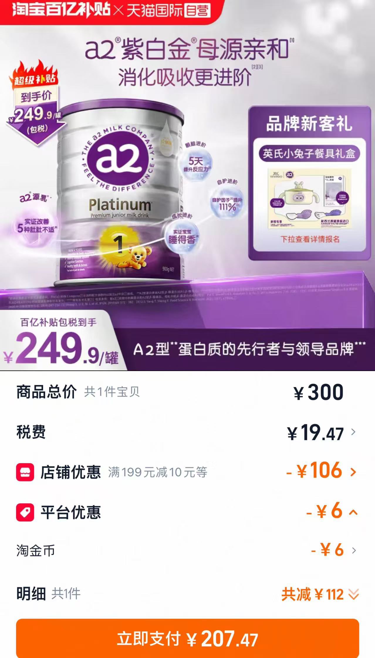 叠19.47税费 单品直降 含税到手207.4亓 1罐装 a2新升级白金版牛奶粉1段900g