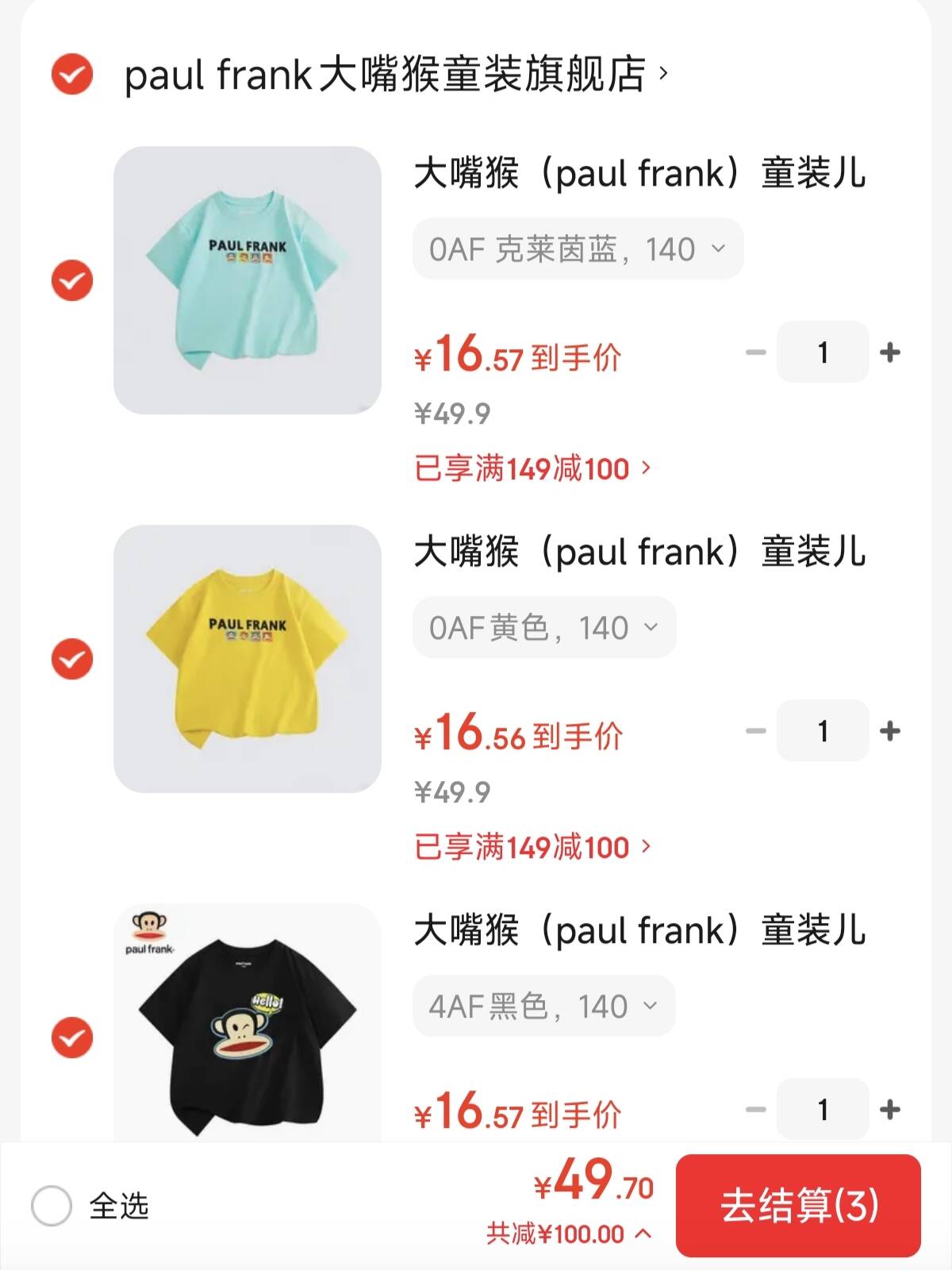 16.5/件大嘴猴paul frank 儿童纯棉T恤 拍件49.7元