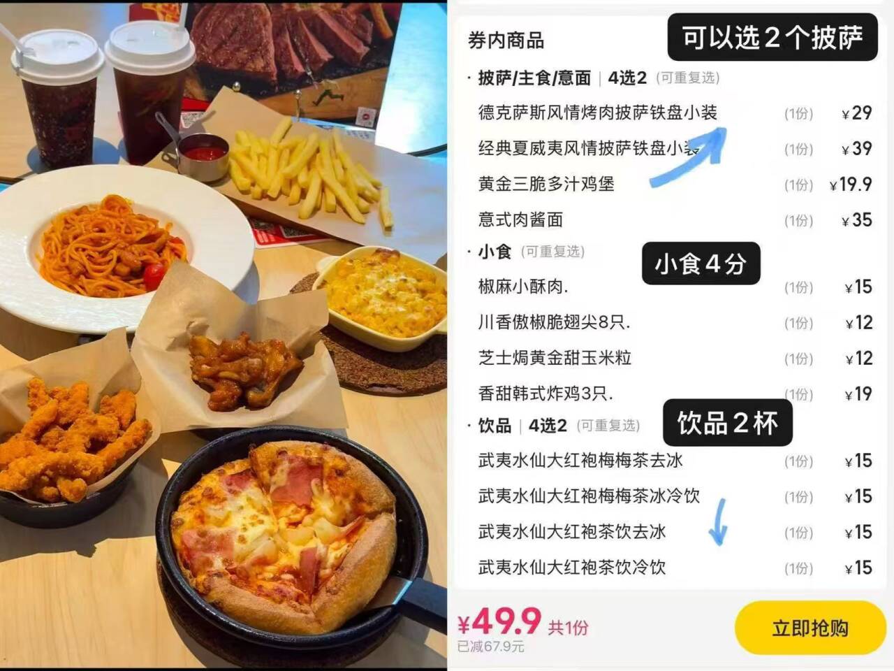 补了必胜客八件套49元 2份主食 4份小食 杯饮品 天内可用先囤 跟闺蜜一起吃