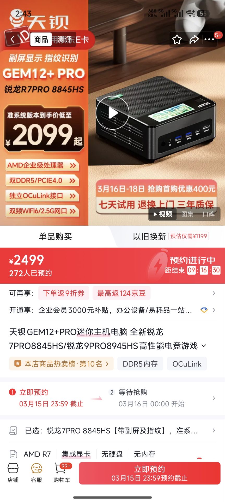 天钡GEM12 PRO迷你主机锐龙7PRO 8845HS 带副屏及指纹 准系统