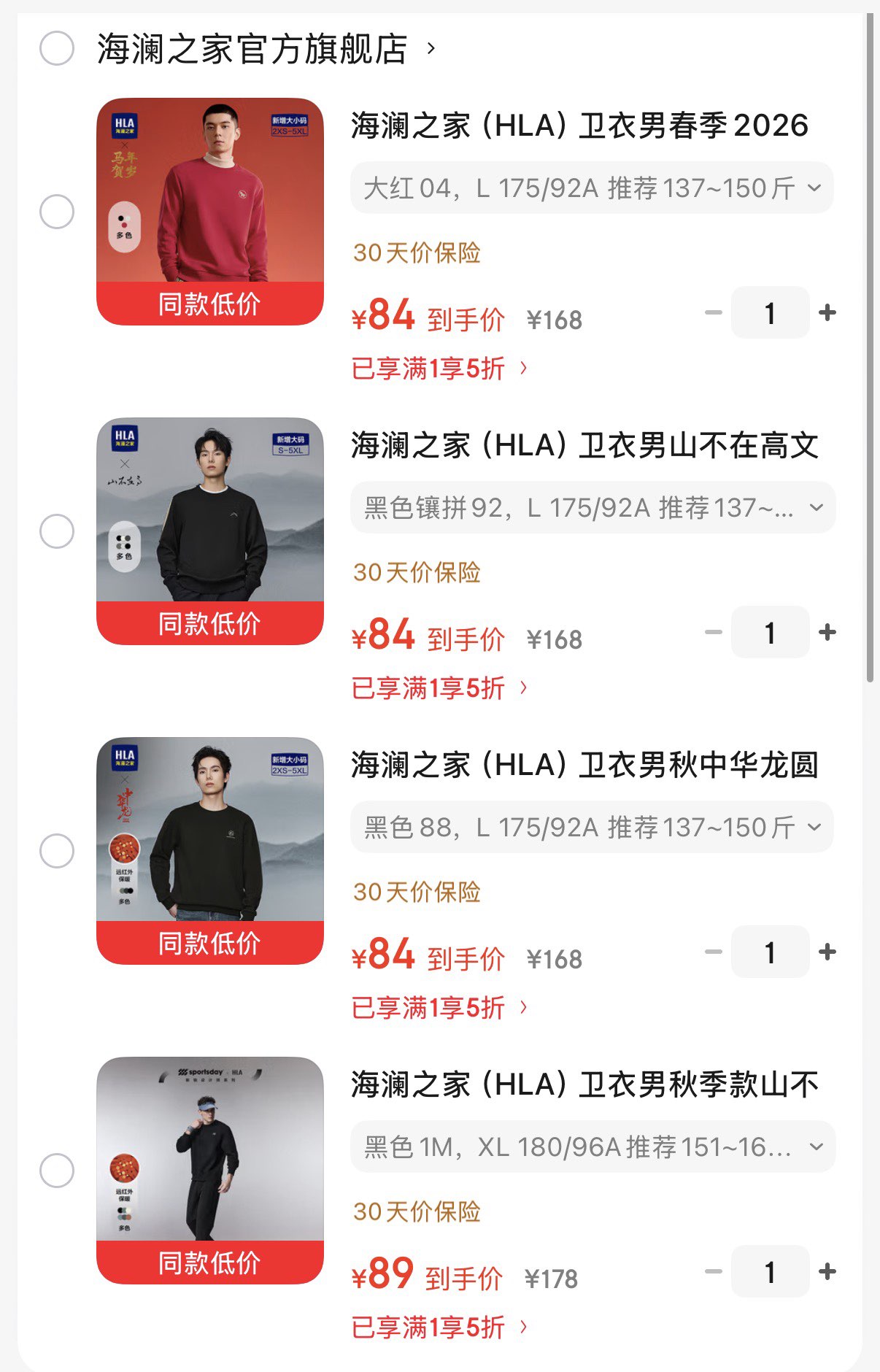 领5折券 一键领券 海澜之家卫衣 84元 山不在高系列卫衣 89元