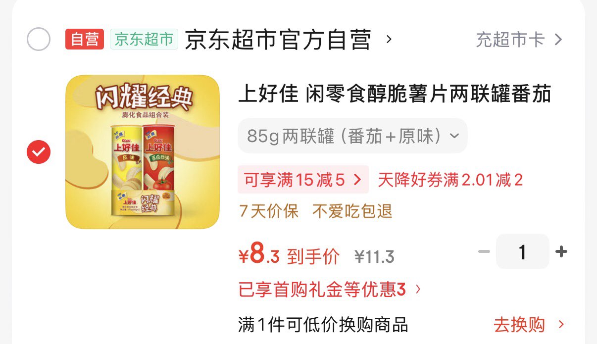 上好佳 闲零食醇脆薯片两联罐番茄口味85g 原味85g,部分砸落2奍 首购1李金,8.3