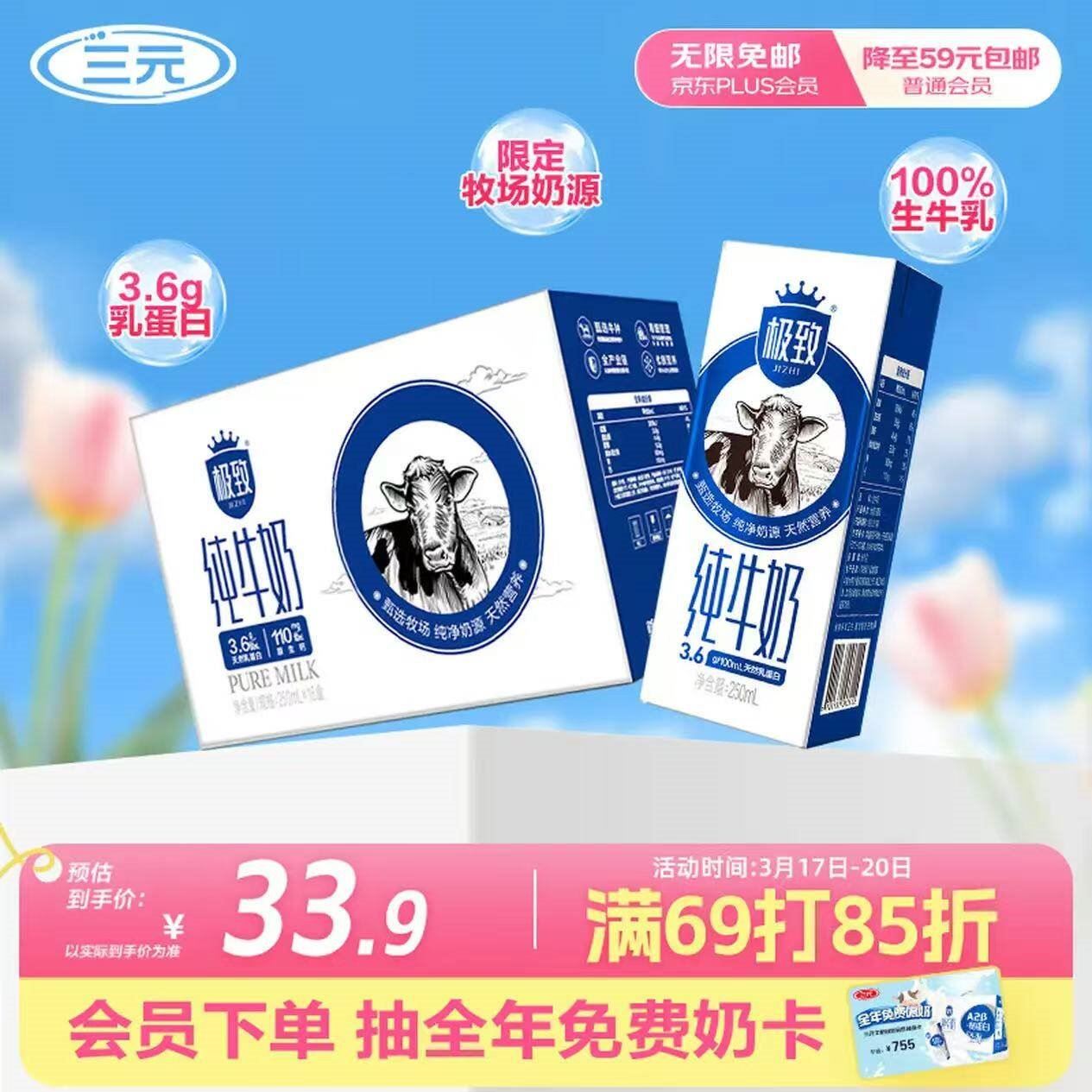 自营 极致纯奶250ml*16盒 买2件67.8元 新客再减3元 *才折2元/盒