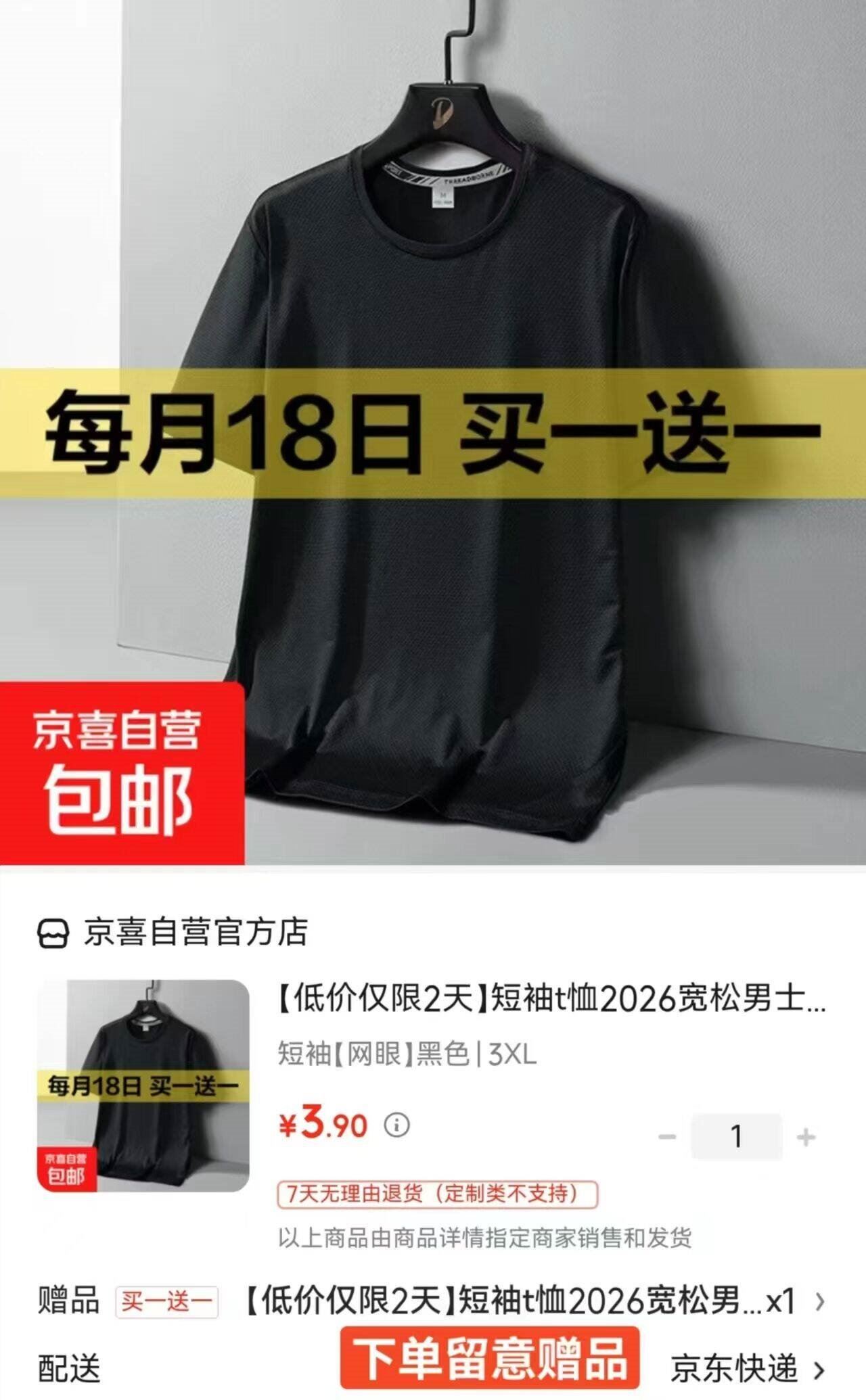 京喜服饰买1贈1 京喜自营 男速干透气短袖t恤 3.9元 才折1.9元/件