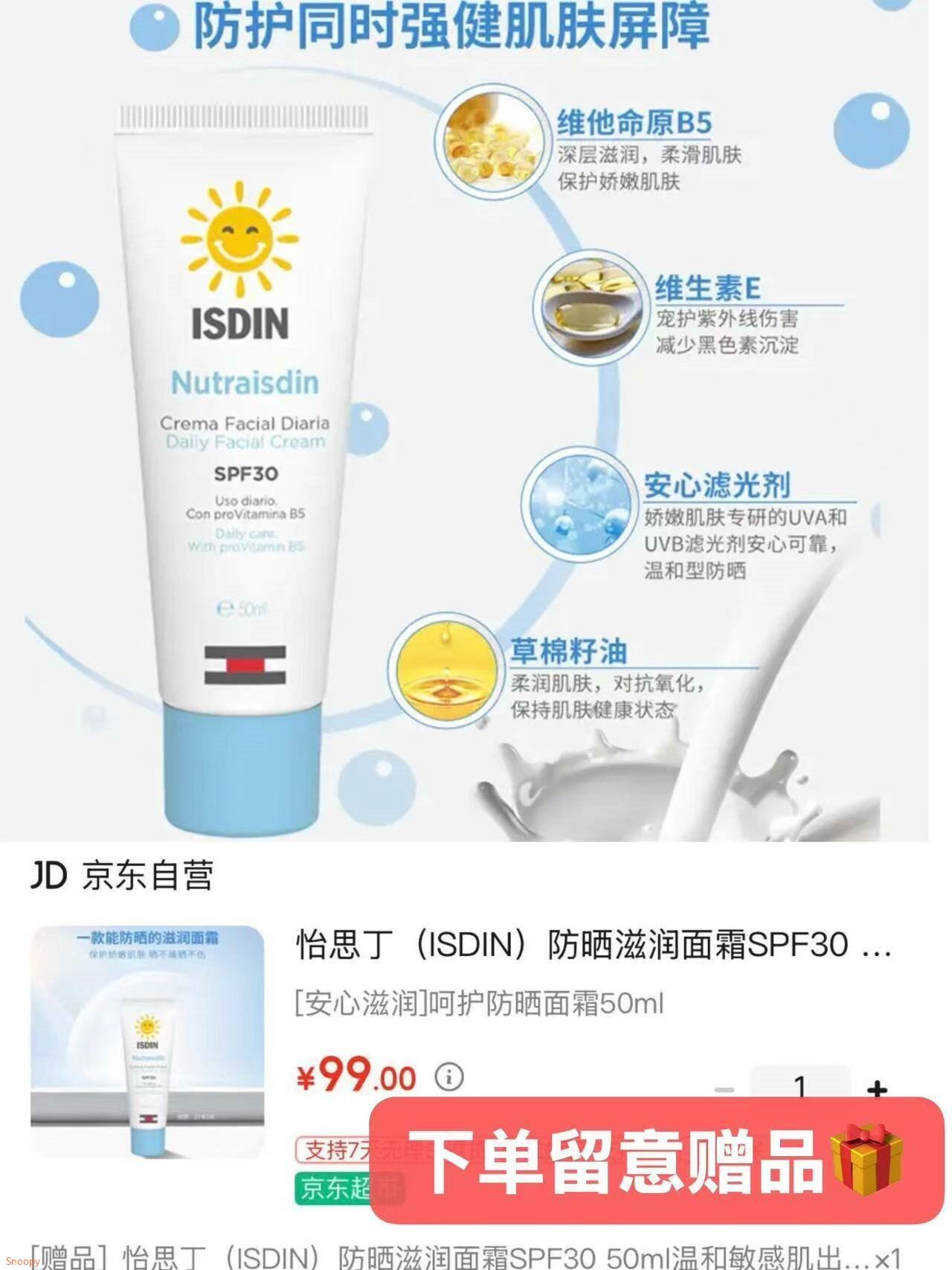 大牌防嗮提前备 先領99-40奍 怡思丁 防晒滋润面霜50ml 59元自营包U