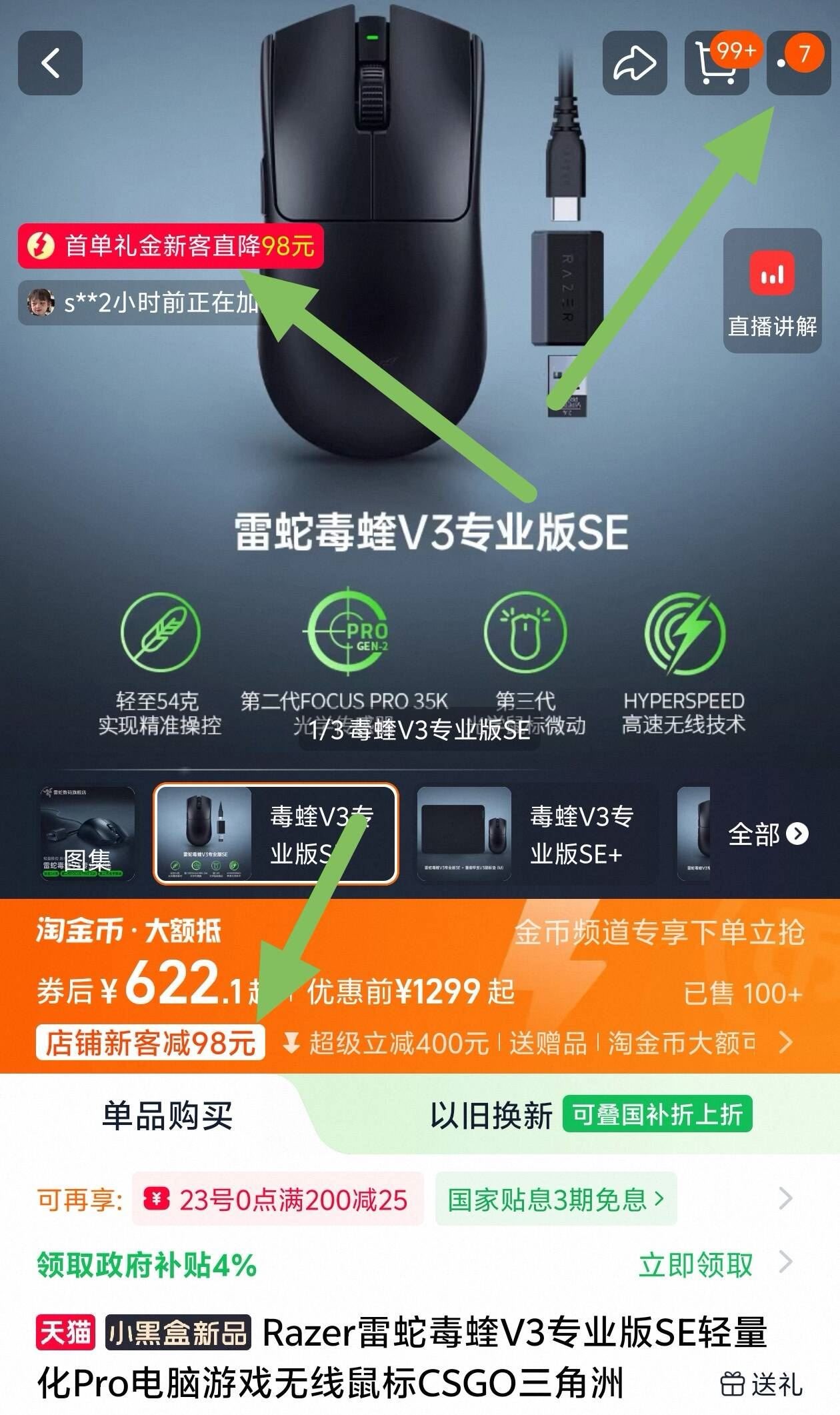 雷蛇毒蝰v3pro SE 需叠加店铺98首购 没有换号 复制这条信息打开手机陶宝
