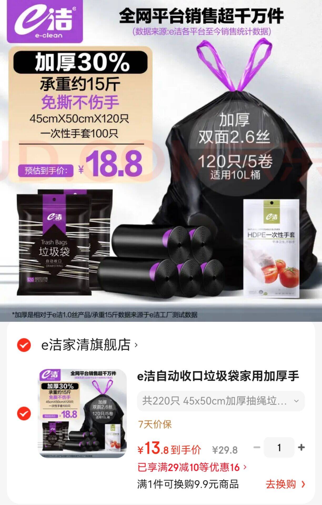 e洁 抽绳加厚垃圾袋120只 贈手套100只220只13.8元
