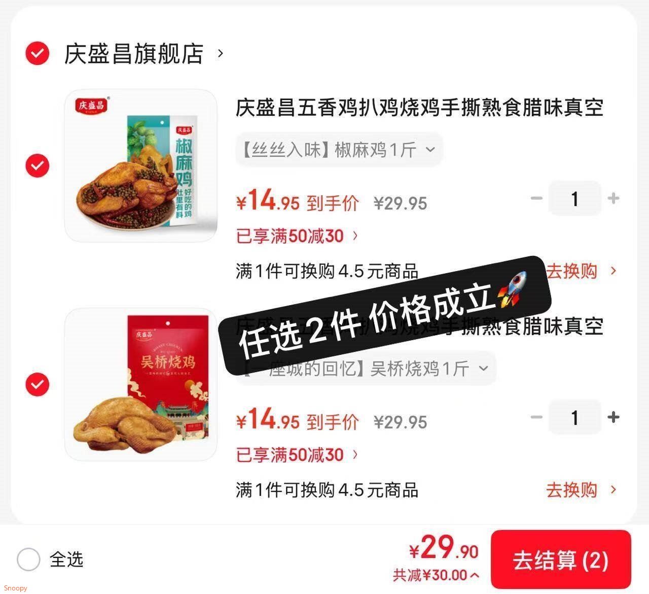 庆盛昌 手撕椒麻鸡/烧鸡1斤 任选2件29.9元 折14.9元/只 *开盖即食