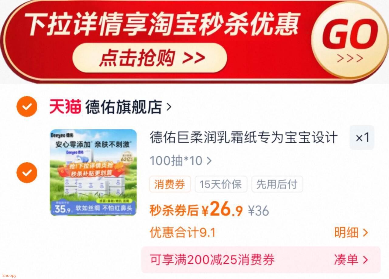 9. 德佑婴儿云柔巾100抽*10包 下拉详情26.92元.6/包! 大张又大包