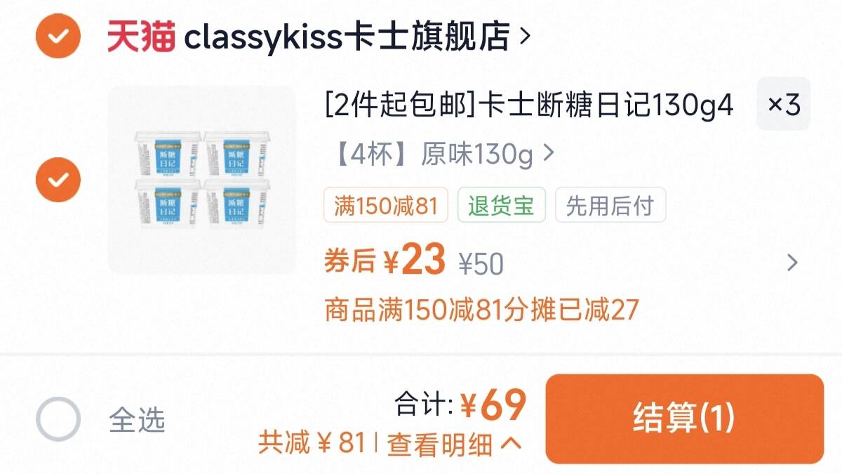卡士断糖日记无蔗糖酸奶 3 件 69130g*12杯 69 元