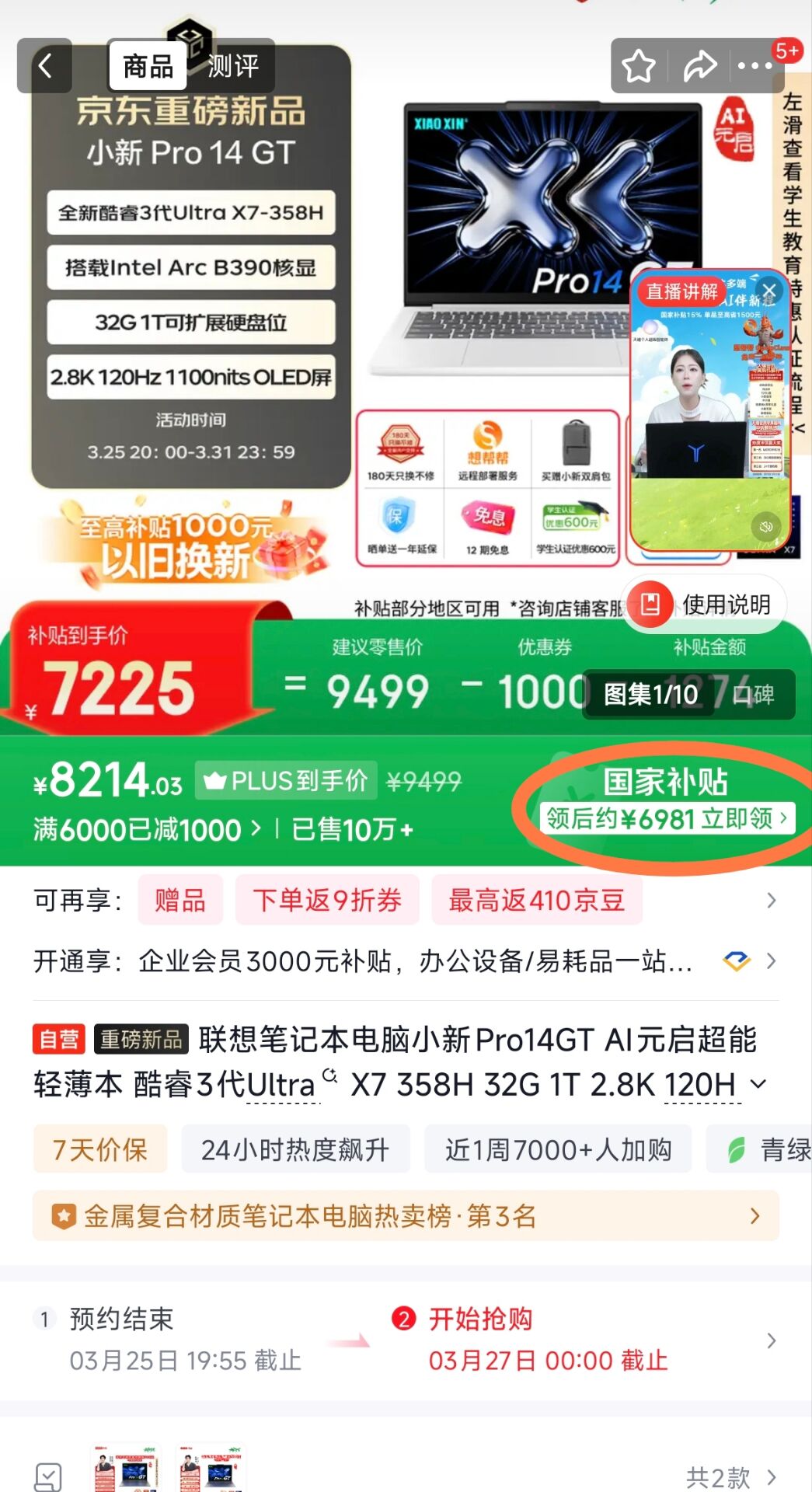 联想笔记本电脑小新Pro14GT 酷睿3代Ultra X7 358H 32G 1T 2.8K 120Hz【6981】plus叠国补