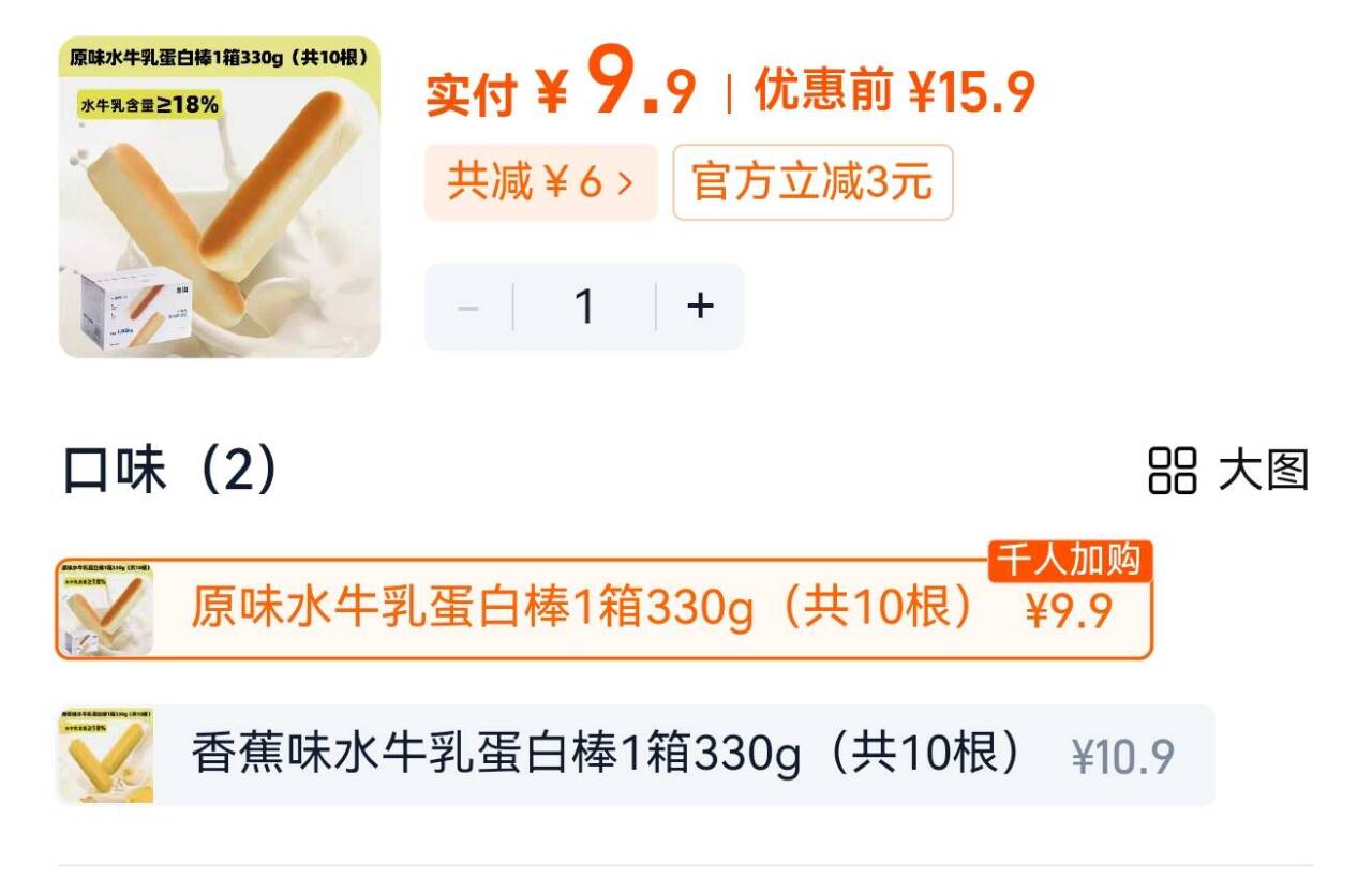 熊治水牛乳蛋白棒面包 10 根 300g 9.9元