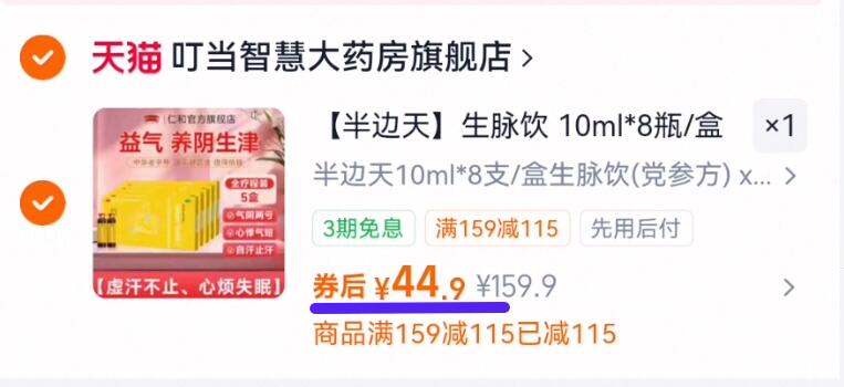 半边天生脉饮10ml*40支 44.9元