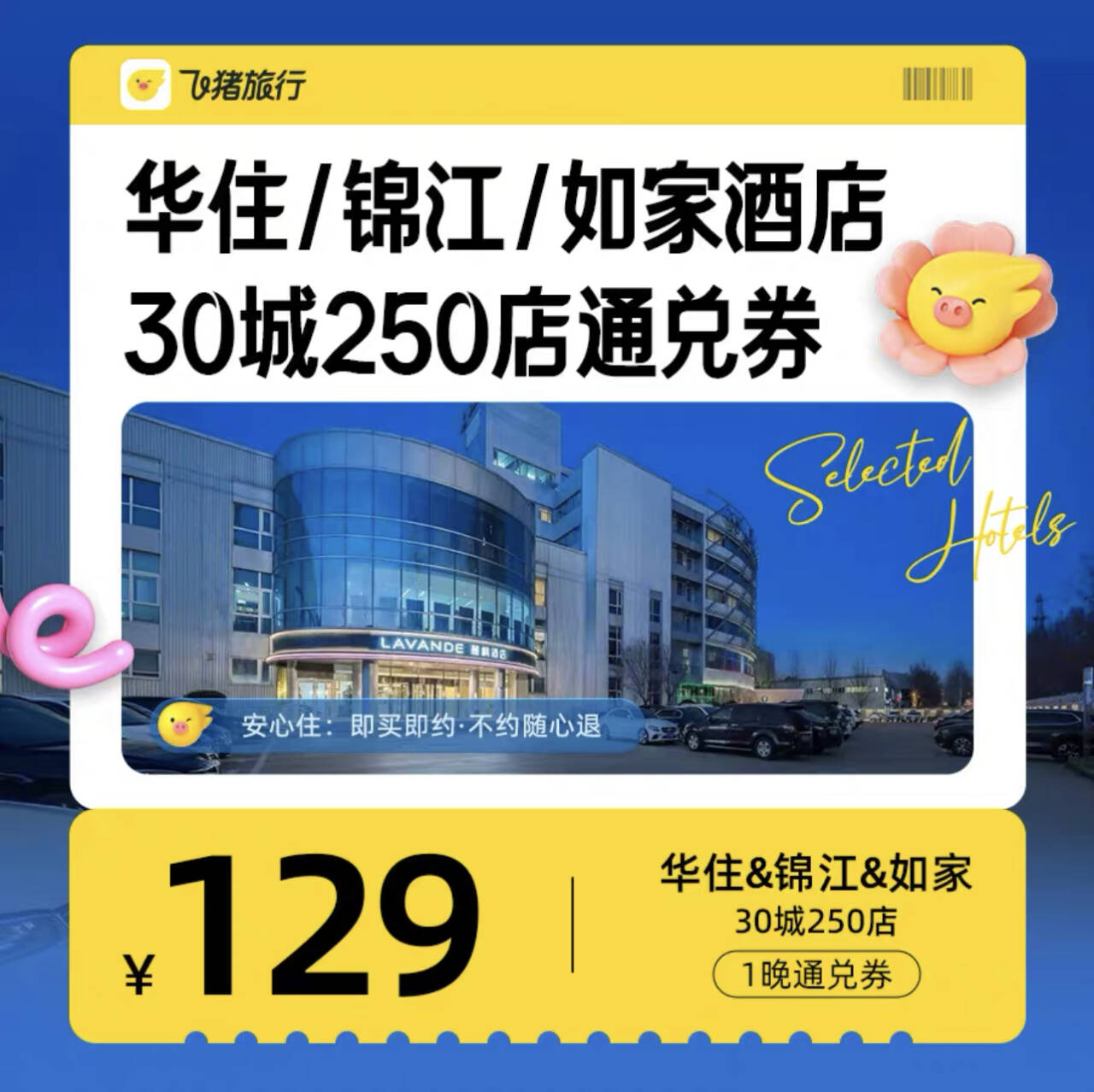 华住锦江如家酒店129元 30城市250店1晚通兑 129元