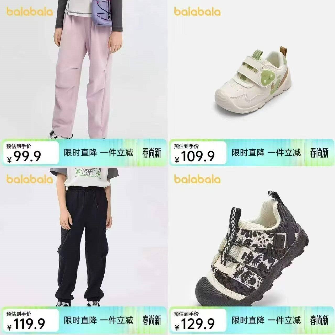 巴拉巴拉女童吸湿休闲长裤 89.9元,巴拉巴拉男童春秋防滑运动鞋 99.9元