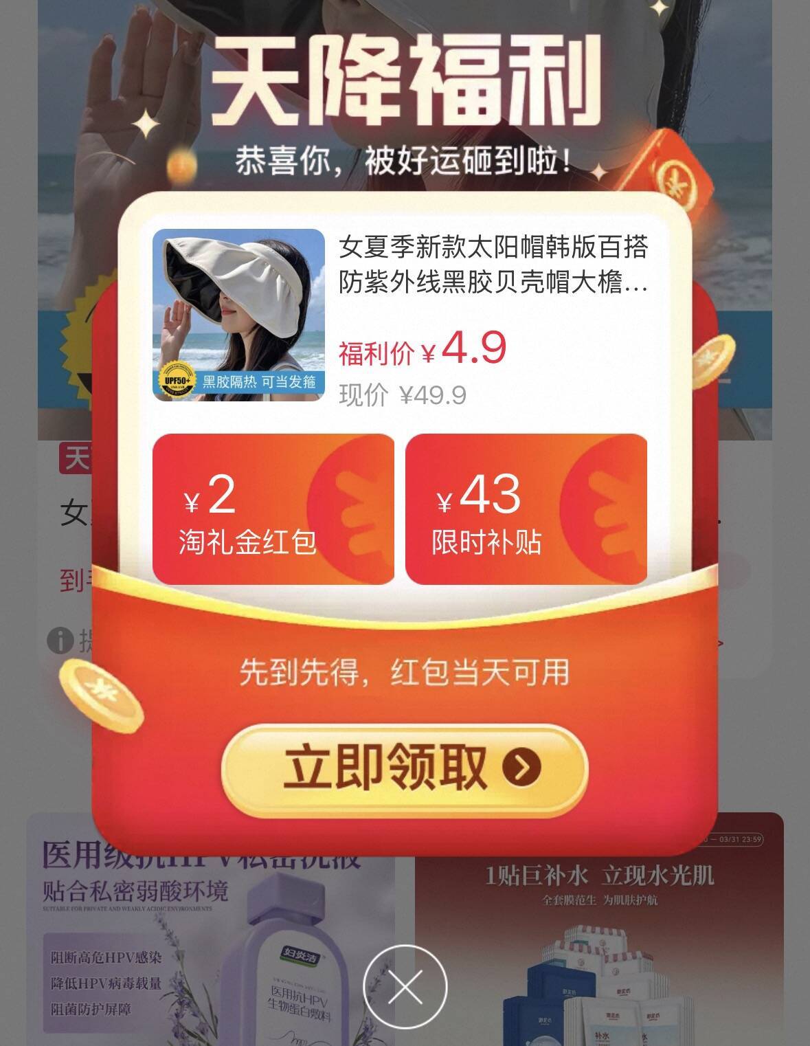 天降李琻4.9元 <br />大帽檐防晒帽多色任选<br