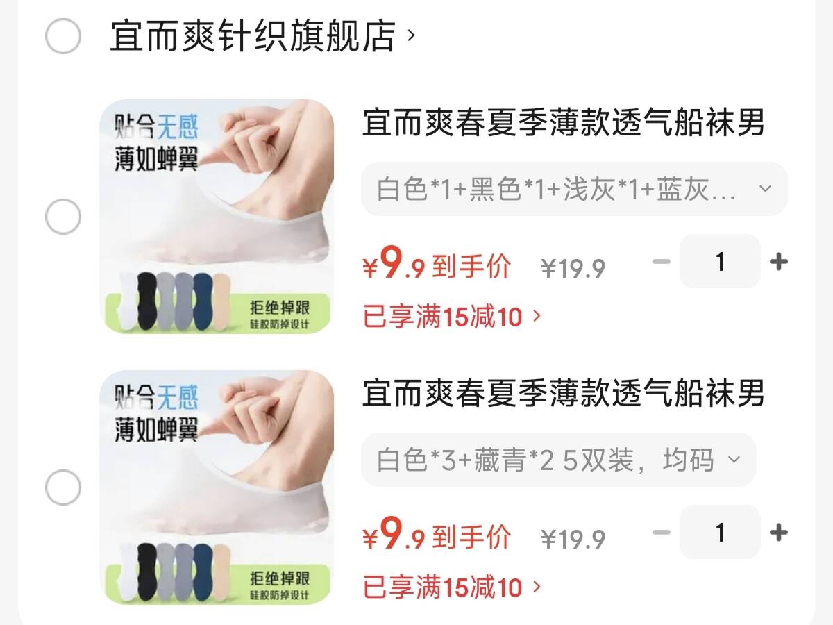 宜而爽透气船袜5双9.9元!